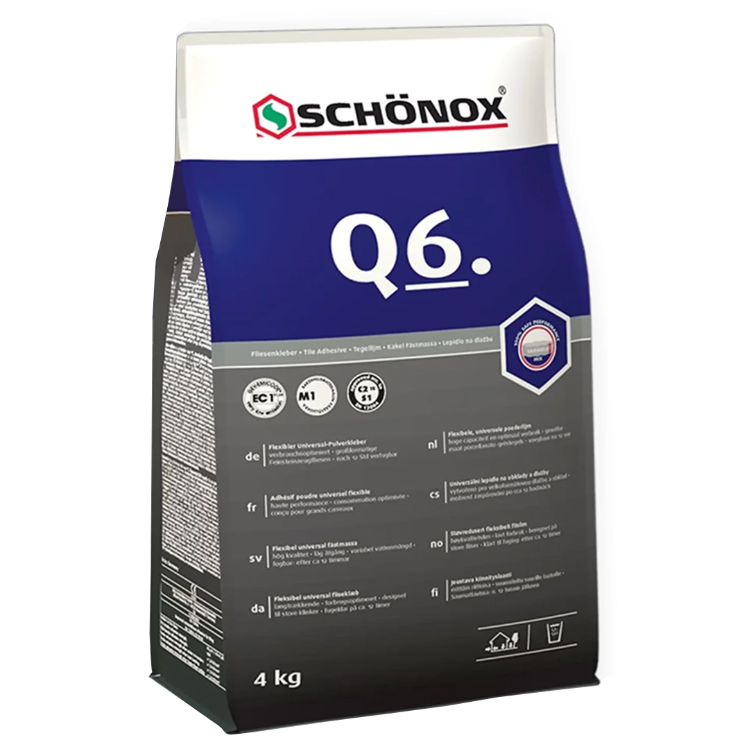 De Schonox Q6 poederlijm is een hydraulisch verhardende, hoog flexibele tegellijm die speciaal is ontwikkeld voor professionele toepassingen. Deze geavanceerde poederlijm bevat lichtgewicht vulstoffen en is zeer verbruiks- en verwerkingsgeoptimaliseerd, waardoor je efficiënt kunt werken met minimale stofontwikkeling.